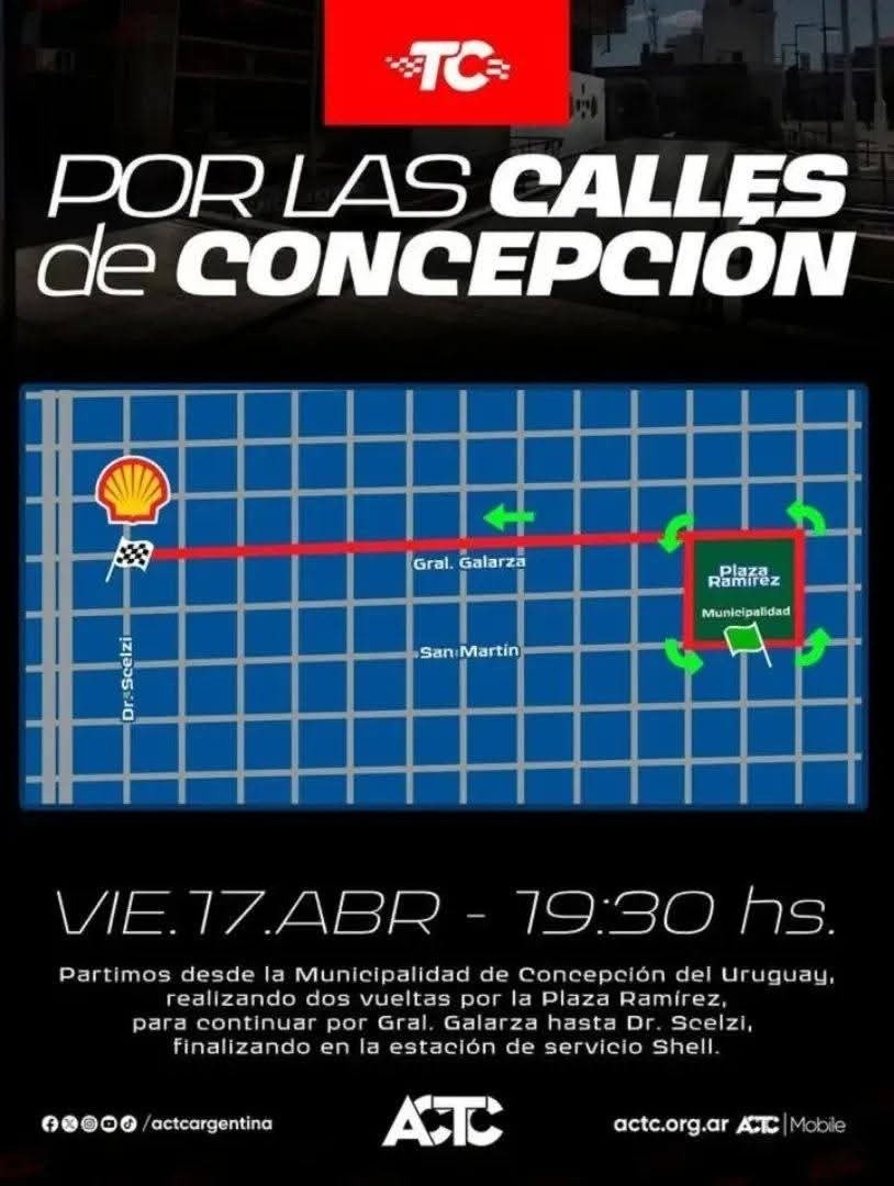 Este viernes, el centro de Concepción del Uruguay será escenario desde las 19:30 horas de una propuesta única para los fanáticos del automovilismo: los autos del Turismo Carretera recorrerán distintas calles de la ciudad en una exhibición abierta al público.